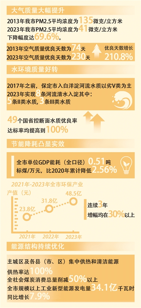 大氣質量大幅提升。2023年,全市PM2.5年平均濃度41微克/立方米,分別比2012年、2018年下降71.9%、38.8%;空氣質量優良天數230天,優良天數比例63.0%。