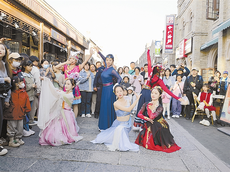 節日期間,人潮涌動的景象成為西大街的獨特風景——這條老街煥然一新,古色古香的街道熱鬧非凡,氛圍感十足。互動滿滿的非遺老店、口味豐富的特色小吃前人頭攢動,深受游客喜愛;舞龍舞獅、鑼鼓表演等民俗演繹讓游客在街巷穿梭中感受著濃厚的文化氛圍。同時,西大街推出新的演藝項目和打卡點,如“千人彩繪”“臉譜傳情”“舞臺炫彩,文藝獻禮”文藝匯演、“我在保定”等,歡快的舞蹈讓游客們情不自禁地加入其中,共享愜意時光。“保定是我和家人念念不忘的城市,這次是我們一家老小‘二刷’保定了,收獲比之前更多。”10月1日下午,來自北京的游客張爽和家人在西大街開啟假期第一站。她告訴記者,在這里不僅能感受繁華街區的濃濃煙火氣,還能在一磚一石、一房一瓦中游覽古建筑,觸摸歷史。據了解,國慶假期第一天,西大街接待客流達4萬人次,同比增長了74.71%。