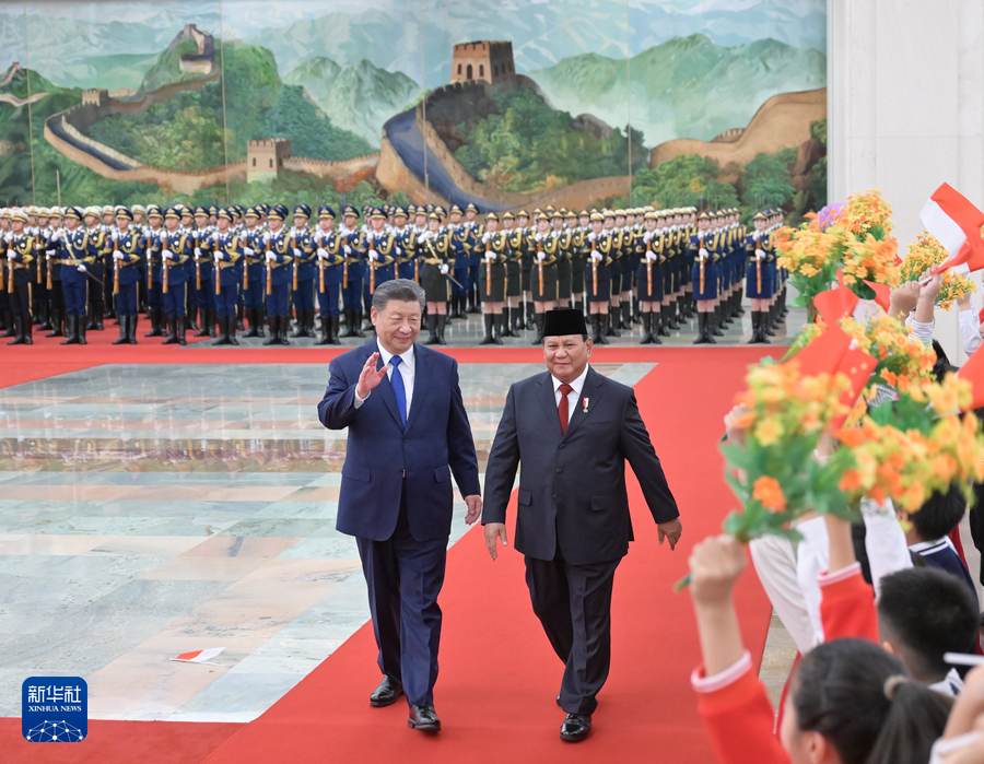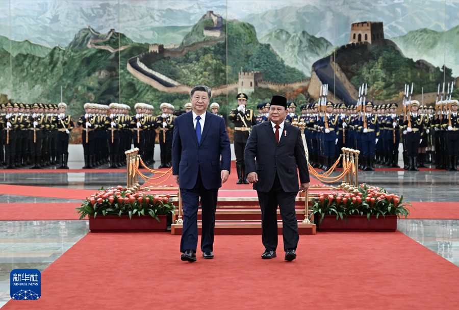 11月9日下午,國家主席習近平在北京人民大會堂同來華進行國事訪問的印度尼西亞總統普拉博沃舉行會談。這是會談前,習近平在人民大會堂北大廳為普拉博沃舉行歡迎儀式。