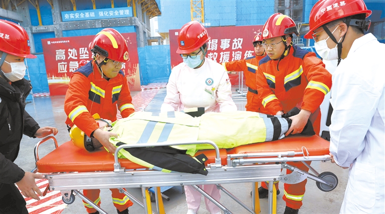 11月14日,2024年保定市房屋建筑工程智慧應急演練暨安全生產標準化觀摩活動在深圳園舉辦。圖為救援隊與醫務人員救助腳手架坍塌被困傷者。 保定新聞傳媒中心記者 翟志剛 攝
