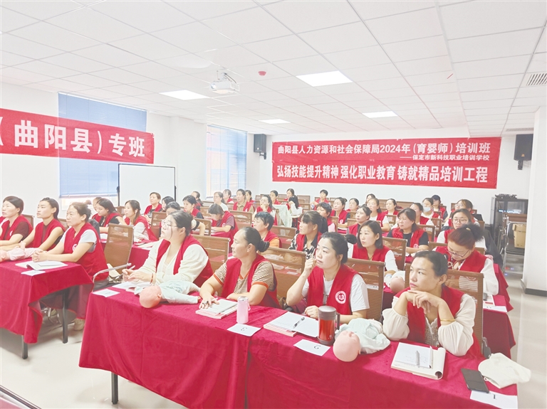 在競秀區數智·人力資源服務產業園里,正在進行一場育嬰員免費技能培訓,30多位學員們在講師的指導下進行按摩、清洗等訓練,姜穎學得格外認真。她說,這是她今年第3次參加技能培訓班了。