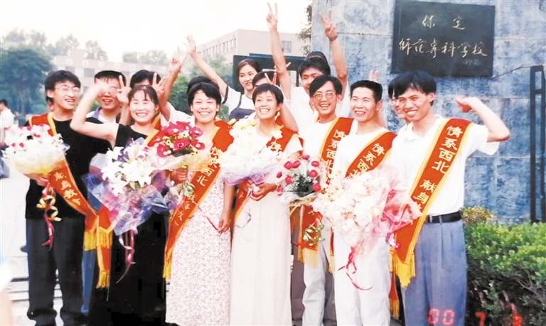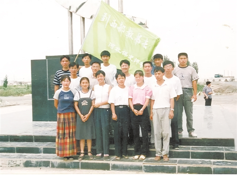 2000年,即將赴新疆任教的畢業生在母校(原保定師范專科學校)門前合影留念。