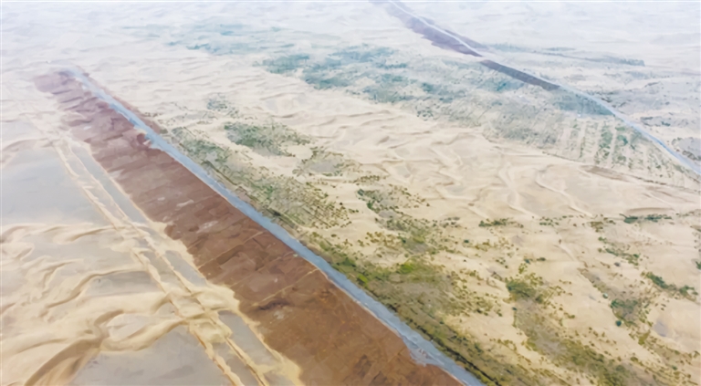 從空中俯瞰新疆且末縣車爾臣河以東的防沙治沙綠色長廊。(資料片)