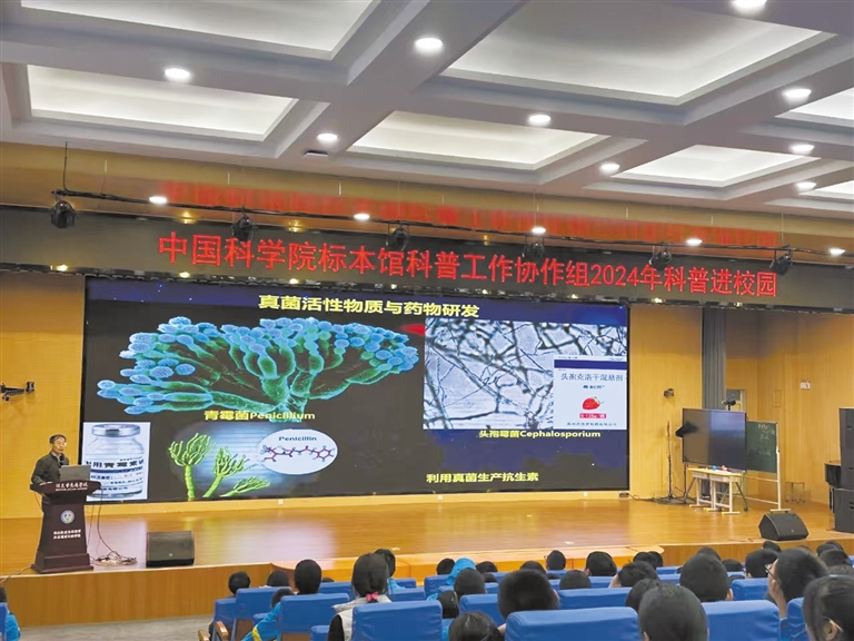 在保定市競秀學校,中國科學院沈陽生態所標本館的專家,給學生講解生物多樣性保護與真菌資源可持續利用。 保定市競秀學校供圖