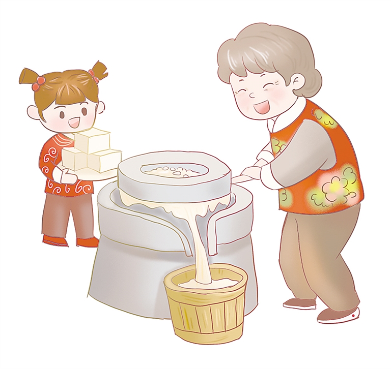 臘月二十五左右,父親要炸年貨了,這是我最喜歡的。炸年貨之前先要做豆腐攤饹馇,父親會叫上我跟著他去晃磨。磨是趙叔家的,整個南街只此一家。豆子已經被父親提前泡好、揉碎、去皮,浸在清水里。磨放在一間小屋里,房梁上垂吊下兩根繩,綁在磨把兩端。我前腿繃,后腿彎,雙手緊握橫著的磨把,父親則一只手輕扶著磨桿,一只手拿著勺子舀起連湯帶水的豆子,放進磨盤上的小洞里。隨著磨盤吱吱扭扭地轉動,乳白色的豆漿順著磨壁流下來,一股綠豆的清香漾滿小屋。