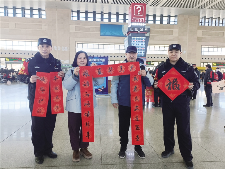 1月14日上午9時許,保定鐵路俱樂部組織的鐵路退休職工表演的各類舞蹈,在保定火車站東廣場火熱開場。旅客陸續(xù)拖著大包小包走進候車大廳,滿懷期待地踏上回家的路,也有不少旅客停下腳步,在候車大廳設(shè)置的春聯(lián)、福字免費領(lǐng)取處,領(lǐng)取春聯(lián)、福字等新年禮物。