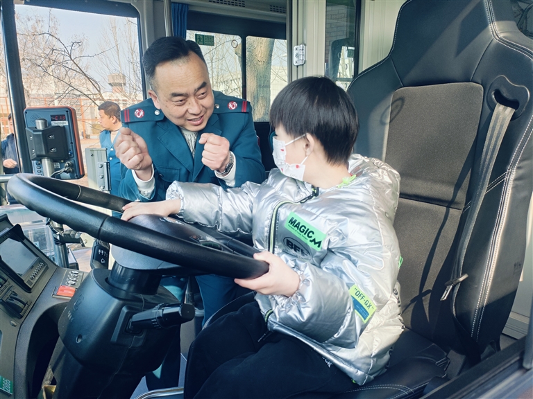 此外,公交志愿者們還帶著滿滿的關懷與溫暖走進兒童福利院、養老院。孩子們開心地收到牛奶、零食禮包等慰問品,并好奇地走上公交車,在志愿者的協助下,輕輕轉動方向盤,感受操控的奇妙,臉上滿是興奮與專注。