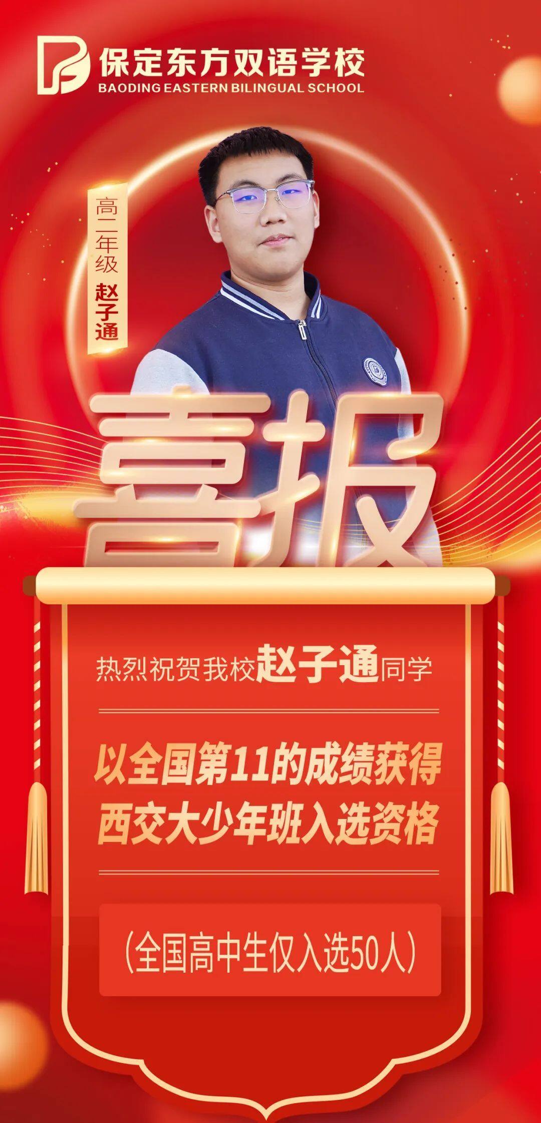 近日,西安交通大學少年班復試結果出爐,保定東方雙語學校高二年級學生趙子通以全國第11名的優異成績成功獲得入選資格,這一消息在學校乃至全市都引起了廣泛關注。