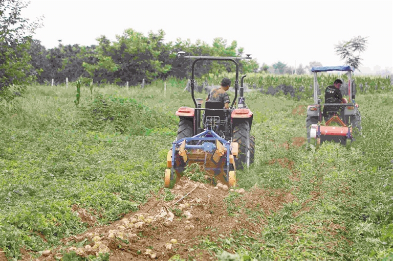 保定晚報訊(通訊員賈晨陽)7月2日,淶水縣義安鎮南鄭各莊村的200余畝馬鈴薯迎來集中采收。田間地頭,殺秧機、收割機轟鳴作業,村民們忙著分揀、裝袋,一個個飽滿結實的馬鈴薯在陽光下泛著金黃色的光澤。
