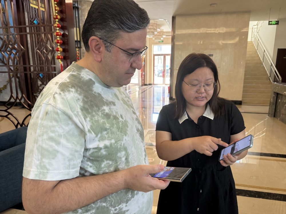 伊朗采購商在白溝新城了解箱包產品。 新華社記者 王美祺 攝