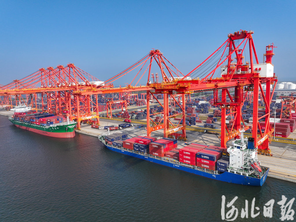 河北港口集團唐山港京唐港區集裝箱碼頭,新一代穿越式雙小車自動化岸橋正在進行作業。(河北日報資料片)