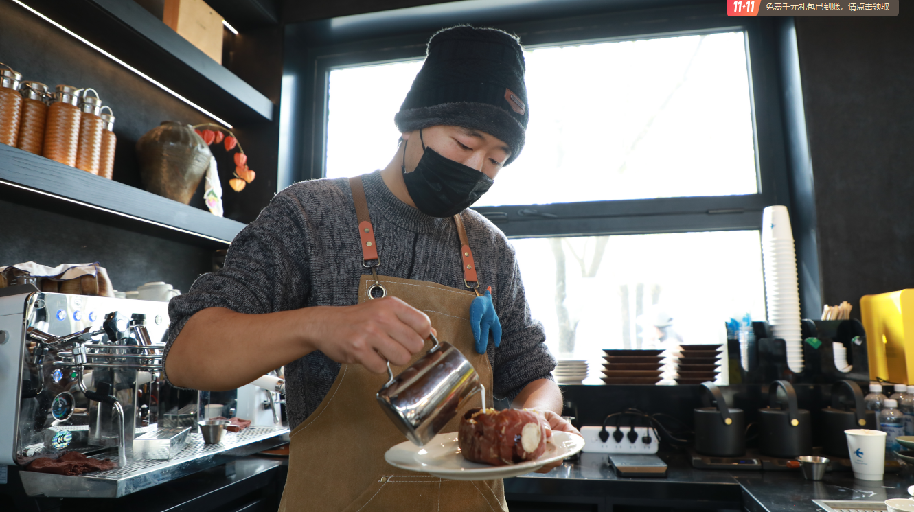 以狼牙山烤紅薯為基底,取鮮牛奶中深拼配咖啡豆,萃取出咖啡濃縮液,再兌入純牛奶,并用奶泡拉出精美圖案。11月9日,保定市易縣西陵鎮鳳凰臺村“慢慢山茶咖”內,咖啡師楊繼正嫻熟調制烤紅薯拿鐵,香氣四溢。