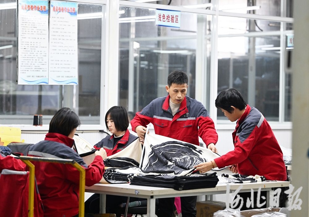 11月14日,安美橋(南宮)羊絨制品有限公司首席質量官趙建軍(右二)在檢查羊絨圍巾質量。河北日報記者趙永輝攝