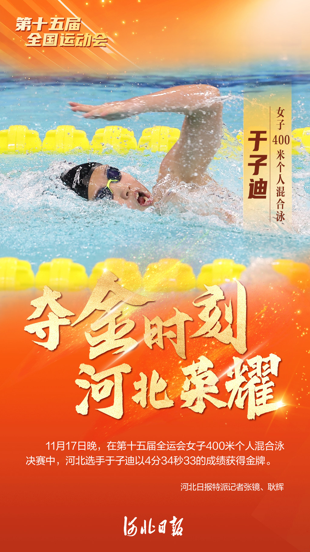 11月17日,第十五屆全運會游泳比賽全部完賽。最后一個比賽日中,我省13歲小將于子迪在女子400米個人混合泳決賽中獲得金牌,何宇博獲得我省男子400米個人混合泳項目首枚全運會獎牌,為河北游泳隊本屆全運會比賽畫上了圓滿的句號。