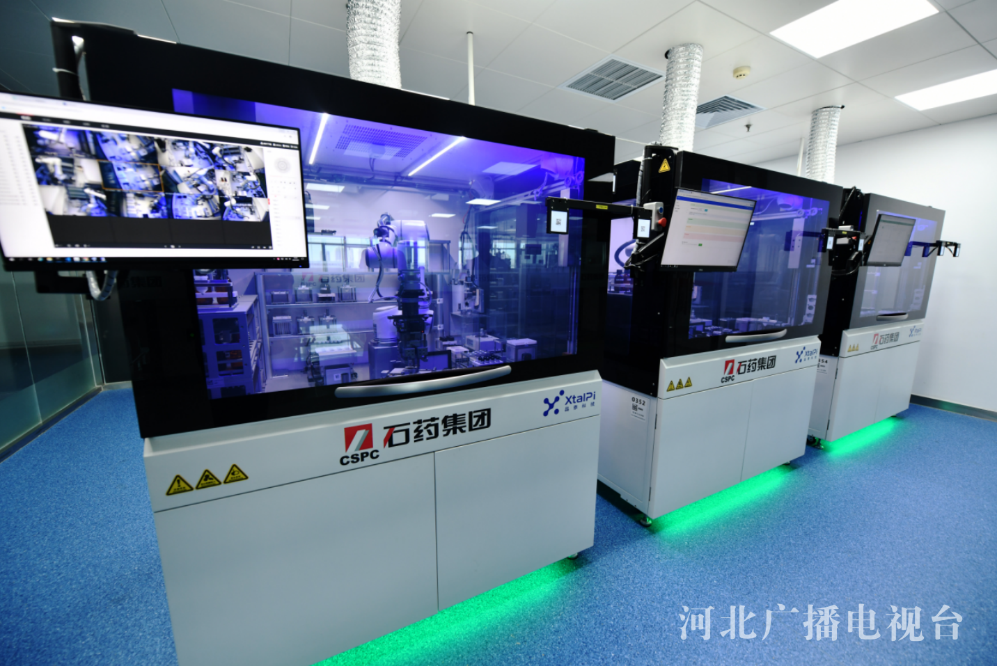 石藥集團潤石研究院AI自動化合成實驗室內,全自動合成工作站正在提取樣品,進行小分子化合物合成操作。